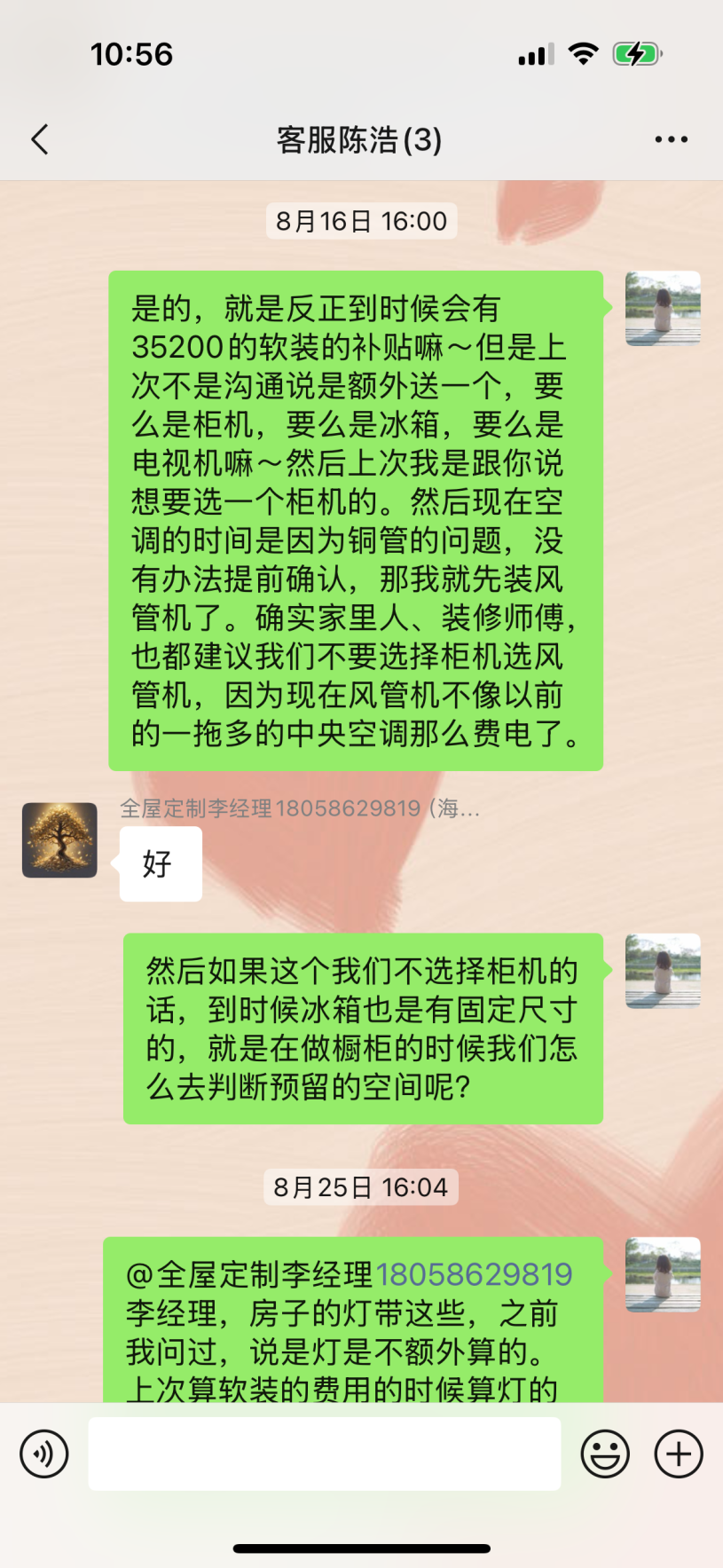 因?yàn)榈谝淮谓佑|這些非傳統(tǒng)裝修的東西,房子也還沒(méi)交付,很多東西都還不懂,所以當(dāng)天我和母親也沒(méi)有直接下單。但期間,兩位李姓工作人員也偶爾會(huì)跟問(wèn)我們交房進(jìn)度之類的。