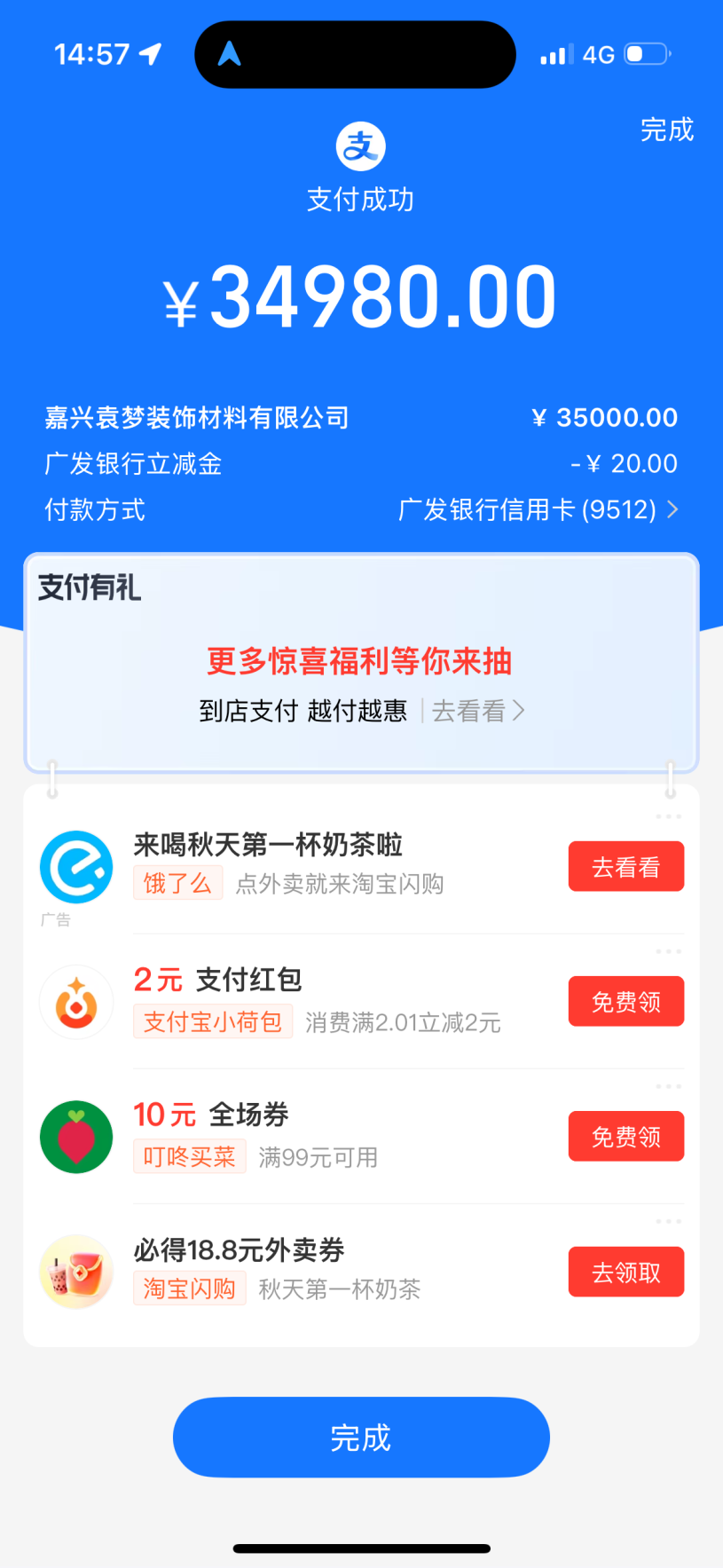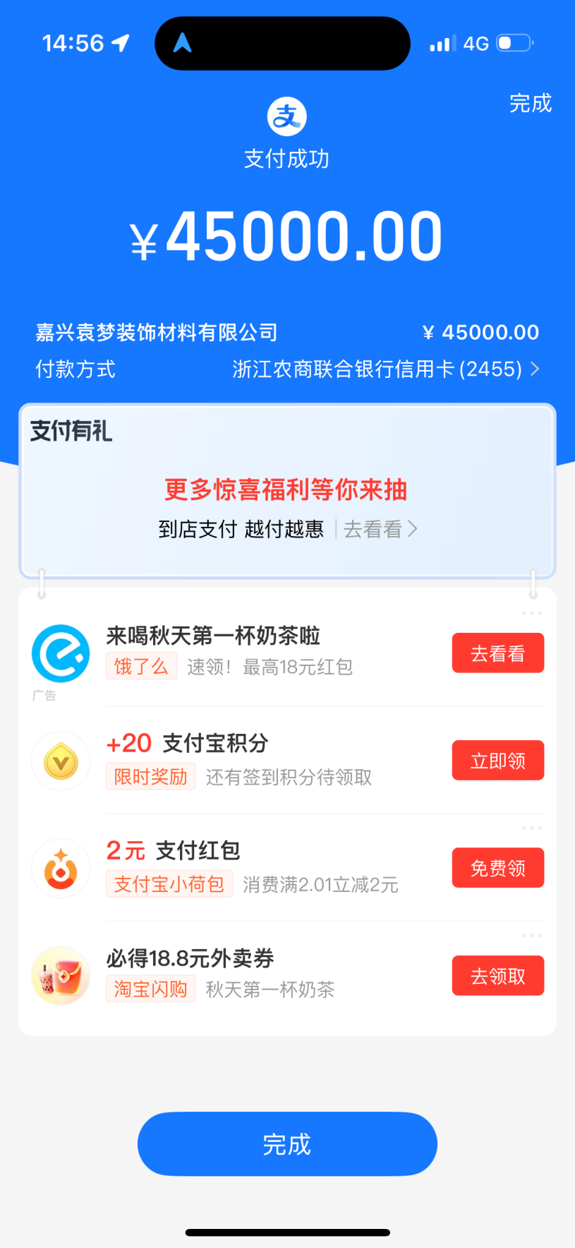 然后再關(guān)于付款比例的問(wèn)題,我和母親以及親戚多次與李經(jīng)理協(xié)商是不是可以按照比如本次支付20-30甚至40%,板材生產(chǎn)后支付多少比例,柜子設(shè)計(jì)好后付多少等等,李經(jīng)理一概拒絕,且表示公司做不了,款項(xiàng)沒(méi)到多少下不了單。后來(lái)我與母親和親戚商量期間,李經(jīng)理在前臺(tái)聊了一會(huì)天,回來(lái)時(shí),李經(jīng)理表示要不然這樣,你今天一次性全款付清,我給你算83000,然后我再送你一個(gè)電器,我也不讓你砸金蛋了,就柜機(jī)、冰箱、電視機(jī),你自己三選一,你可以回去考慮下懸什么你信息發(fā)給我。但是他的合同上仍然寫的是88000,我問(wèn)他我說(shuō)你一直說(shuō)沒(méi)有增項(xiàng),然后你說(shuō)83000,但是合同又是88000,到時(shí)候你們不會(huì)讓我補(bǔ)款吧?他說(shuō)誰(shuí)找你補(bǔ)款,你隨時(shí)找我。然后我掃了他們付款碼支付了45000+35000.