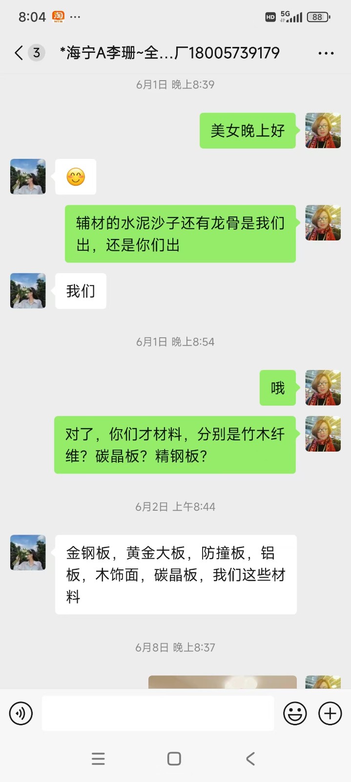 且期間多次在線上/電話咨詢價(jià)格最低可以做到多少錢,對(duì)方一直沒(méi)有給到明確答復(fù),都是說(shuō)讓過(guò)去見(jiàn)面談。當(dāng)時(shí)咨詢他們關(guān)于價(jià)格、拼接工藝、配件品牌、有沒(méi)有額外收費(fèi),回復(fù)的是他們現(xiàn)在不做別的,就是做線條包邊,輔料不管(前期線上李珊承諾水泥沙、龍骨費(fèi)用都是他們出)。