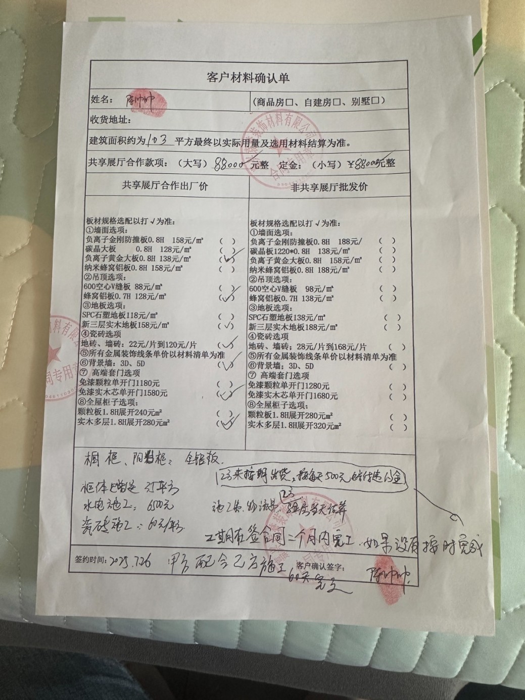 于是8月9日,我從上海、母親以及兩位親戚從溫州一起又再次去到他們廠里。當(dāng)天再次確認(rèn)了系列問(wèn)題:軟裝贈(zèng)送、物流施工補(bǔ)貼、柜子贈(zèng)送等等。且確認(rèn)了軟裝贈(zèng)送是在裝修過(guò)程中根據(jù)實(shí)際的進(jìn)度敲定具體的產(chǎn)品;物流、施工補(bǔ)貼為硬裝完成后,他們會(huì)安排人上門驗(yàn)收并且拍攝視頻作為樣板房推廣視頻,當(dāng)天跟他們對(duì)物流、施工補(bǔ)貼等費(fèi)用的結(jié)算;木工是他們的人,瓷磚需要我們自己找人等等事項(xiàng)。并且談了價(jià)格,我們選擇了他們中間檔的1180元/平的,最終談到880元/平,因?yàn)槲液湍赣H大概也算了一下,他們板材的成本其實(shí)就一二十元一平(因?yàn)槲覀內(nèi)ナ袌?chǎng)也了解過(guò),哪怕非工廠,都才賣二三十最多三四十),他們的板材成本可能差不多算起來(lái)要5-7千,瓷磚+地板成本大概在7-9K左右,軟裝的東西他們肯定是跟他們指定的那些供應(yīng)商有些合作,價(jià)格應(yīng)該會(huì)有一些優(yōu)惠但是跟我們結(jié)算又是按照旗艦店價(jià)格算,35200的軟裝贈(zèng)送,可能實(shí)際應(yīng)該也就2萬(wàn),可能都不到,物流6-7K,稅點(diǎn)6-7k,貼瓷磚6-7k,柜子1W折算下來(lái)他們的利潤(rùn)可能就是一兩萬(wàn)的樣子。所以我們也覺(jué)得因?yàn)樗麄円彩菑S家,所以一般也不會(huì)亂報(bào)價(jià)且確實(shí)按照我們核算他們沒(méi)什么利潤(rùn),但是因?yàn)樗麄円恢睆?qiáng)調(diào)說(shuō)他們是在虧本打造樣板房為了推市場(chǎng),所以砍價(jià)的時(shí)候我們也沒(méi)忍心去談。甚至還想著幫他們?nèi)ジ纱u師傅和水電工談價(jià)(想著幫他們節(jié)省成本),以及我和目前有說(shuō),為了節(jié)省他們的瓷磚成本,我們可以接受櫥柜擋住的地方用庫(kù)存磚,漏出外的地方用我們選擇的磚就可以,這樣他們也能節(jié)省點(diǎn)成本。結(jié)果李經(jīng)理說(shuō)沒(méi)必要,瓷磚也沒(méi)差多少錢的。然后在他答應(yīng)了價(jià)格后,母親也再三確認(rèn)他們沒(méi)有增項(xiàng)了吧,李經(jīng)理信誓旦旦的說(shuō)沒(méi)有,然后去拿來(lái)了合同,我提出你們這個(gè)合同怎么沒(méi)有寫具體材料明細(xì),還有我們溝通的關(guān)于贈(zèng)送軟裝的明細(xì)也沒(méi)有,補(bǔ)貼怎么返也沒(méi)有說(shuō),我們要求合同上去寫明,而且我每提出一個(gè)合同的條款問(wèn)題,他都會(huì)把合同拿過(guò)去然后說(shuō)一句,這個(gè)你不用管的,都是模板,以及一直強(qiáng)調(diào)他們是模板合同沒(méi)法改的,這個(gè)只是為了讓他們下單用的,而且他們會(huì)有材料清單的,另外后期有任何問(wèn)題直接找他就可以了。后來(lái)拿來(lái)了材料清單,我說(shuō)你們這材料清單上這個(gè)價(jià)格怎么這么...他說(shuō)那不用管,你就看上面總金額88000就好了。我母親表示,上面也沒(méi)有說(shuō)明柜子送多少面積、櫥柜陽(yáng)臺(tái)柜是鋁柜、補(bǔ)貼什么時(shí)候補(bǔ)啊,工期也沒(méi)寫,而且你們要求我們按時(shí)付款,那你們?nèi)绻荒馨磿r(shí)完成呢?李經(jīng)理說(shuō)我們沒(méi)有按時(shí)完成一天給你500好吧?母親問(wèn),那我們能不能在上面說(shuō)明呢?他說(shuō)你們寫嘛,我到時(shí)候給你蓋章。于是我和母親在材料確認(rèn)單下方寫明了:柜子贈(zèng)送35平、櫥柜陽(yáng)臺(tái)柜為全鋁柜、水電施工6500,瓷磚60元/平,物流施工補(bǔ)貼乙方交房當(dāng)天結(jié)算、未按期完成乙方需向甲方支付每天500元違約金。