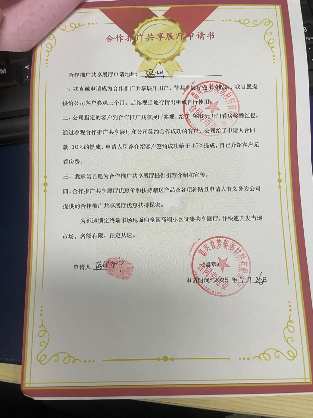 因?yàn)橐恢本€上溝通不出來(lái)個(gè)所以然,而且他說(shuō)可以讓我們付5000元定金讓他們安排人量房設(shè)計(jì),如果到時(shí)候設(shè)計(jì)方案不喜歡,他們扣留3000塊后退回2000元。我表示不能接受,因?yàn)閮r(jià)格都沒(méi)談攏就開始付款了,想談價(jià)格又一直說(shuō)讓過(guò)去談,于是因?yàn)榉孔右呀?jīng)交付,且在他們一次又一次的邀請(qǐng)下7月26日再次從上海驅(qū)車去了他們廠,這次是我?guī)е业囊粋€(gè)同事一起去的,因?yàn)橥乱灿刑追孔又两裎囱b修也了解一下。當(dāng)天也是一樣的,類似上述的內(nèi)容:40%軟裝贈(zèng)送,35平的柜子(但是如果超出了,是按照比30平超出的面積計(jì)算板材價(jià)格,880/平),施工物流補(bǔ)貼等等,以及再次確認(rèn)了板材組合方式的整裝價(jià)格(880.1180.1880),我們確定要做可以談價(jià)格。針對(duì)付款流程,李經(jīng)理表示簽訂合同后定金要付60-70%,板材生產(chǎn)后支付20%,剩下5-10%交房后付,最后壓5%-10%的款三個(gè)月后在支付。當(dāng)時(shí)我們表示沒(méi)有裝修公司是這樣的,都是一個(gè)環(huán)節(jié)一筆費(fèi)用的,他們表示因?yàn)樗麄兪歉鶕?jù)我們的設(shè)計(jì)定制的板材,所以如果我們板材生產(chǎn)好了我們不付款了,他們的板材就廢了。我表示因?yàn)榘宀钠鋵?shí)成本也不高,我們后期不是還有瓷磚、柜子這些都還沒(méi)制作嘛?就算板材生產(chǎn)了,那我支付板材部分的款就好了呀,等柜子要下單了,再付柜子的款。李經(jīng)理表示他們沒(méi)有收到60-70%的款是沒(méi)法下單的。因?yàn)楫?dāng)時(shí)這個(gè)事情沒(méi)有得到很好的統(tǒng)一意見(jiàn),且當(dāng)天我也沒(méi)想著馬上付款,就沒(méi)有再針對(duì)這個(gè)問(wèn)題再深入去談了。后續(xù)李經(jīng)理見(jiàn)我猶猶豫豫,于是表示不然就最低先付3000塊的定金,先確定下來(lái)樣板房的合作名額,以及他們安排人去上門量房以及設(shè)計(jì),如果到時(shí)候不合適,他們扣留500元,剩下的全退?;诖_實(shí)來(lái)回好幾次了,而且關(guān)于房子面積(因?yàn)槲覀兪强蚣芊浚┻€沒(méi)出來(lái),所以總價(jià)也還不好談。當(dāng)天就簽了他們所謂的《合作推廣共享展廳申請(qǐng)書》支付了3000元定金。