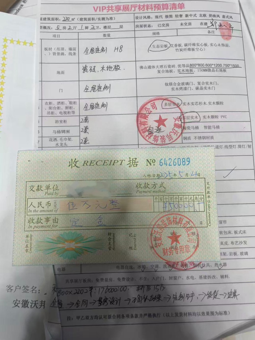 他們的套路還包括:讓客戶墊付物流、人工、輔材費(fèi),承諾后期返還,實(shí)則不會(huì)兌現(xiàn);選材料時(shí)要求繼續(xù)加錢,不加錢就不發(fā)貨,態(tài)度與簽約前判若兩人;利用含糊不清的合同文本設(shè)下陷阱,前期 “全包”“不增項(xiàng)”“補(bǔ)貼” 等承諾都是誘導(dǎo)欺詐的幌子,“返利” 條款實(shí)為后續(xù)天價(jià)收費(fèi)的伏筆;工廠提供的墻面吊頂材料、瓷磚均是三無品牌,價(jià)格比市場(chǎng)價(jià)高 4-5 倍,且運(yùn)費(fèi)、輔材、安裝費(fèi)需客戶自己承擔(dān)。此外,我支付的5萬元僅收到普通收據(jù),該公司存在明顯的偷稅漏稅、虛報(bào)逃稅嫌疑。?