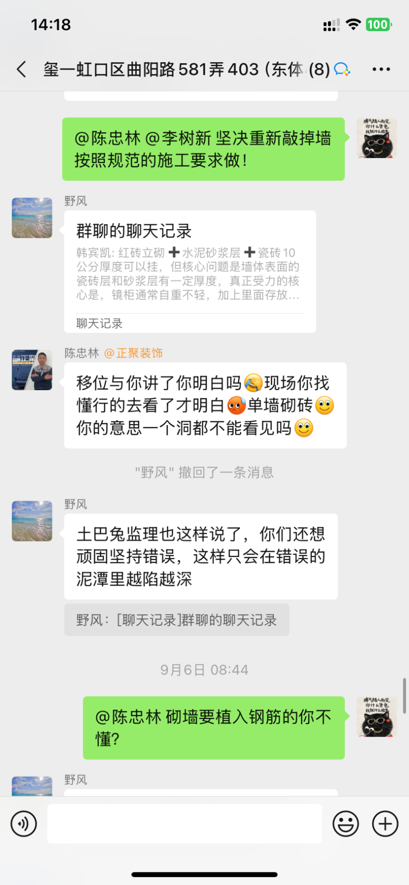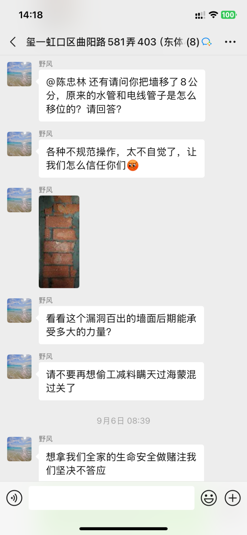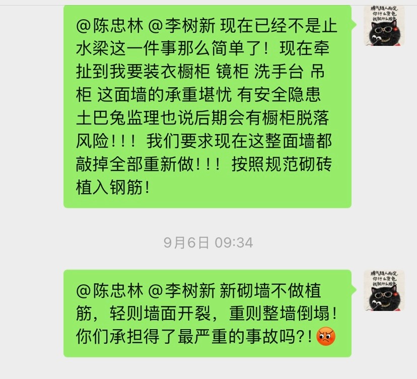 后期我這墻上還要掛吊柜、鏡柜、洗手臺(tái)柜體,這薄墻能承受住那么多重量嗎?項(xiàng)目經(jīng)理陳忠林大言不慚地拍胸脯說(shuō)可以承重500斤!為此我們也12345投訴了,迫于壓力正聚公司派出2位工程部經(jīng)理輪番來(lái)談判,他們談判的訴求無(wú)疑就是單方面保證這面墻就算沒(méi)有鋼筋也不要緊,不會(huì)倒塌,不會(huì)有任何風(fēng)險(xiǎn)。但是我們請(qǐng)的第三方監(jiān)理為了安全考慮,要求他們把墻拆掉按照規(guī)范要求砌墻,下面做地梁!他們對(duì)監(jiān)理提出的方案表示否認(rèn),不肯拆掉重做!而且陳忠林始終不認(rèn)為自己有錯(cuò),態(tài)度上非常強(qiáng)硬,死扛自己是沒(méi)問(wèn)題的!這種態(tài)度讓我們?nèi)虩o(wú)可忍,最后談不攏,我們提出要和正聚解約,10月15日正聚的結(jié)算單上居然還要我們付20%的違約金18000。因?yàn)樗麄兊馁|(zhì)量問(wèn)題又不肯整改,而且我們?cè)谔岢稣姆桨负蠛荛L(zhǎng)一段時(shí)間他們沒(méi)有任何回應(yīng),停工也快一個(gè)月了,這種情況我們要求解約,還要算我們違約?真的是沒(méi)有天理了!
