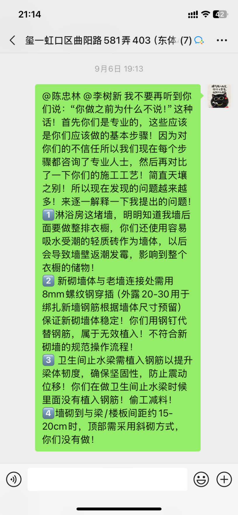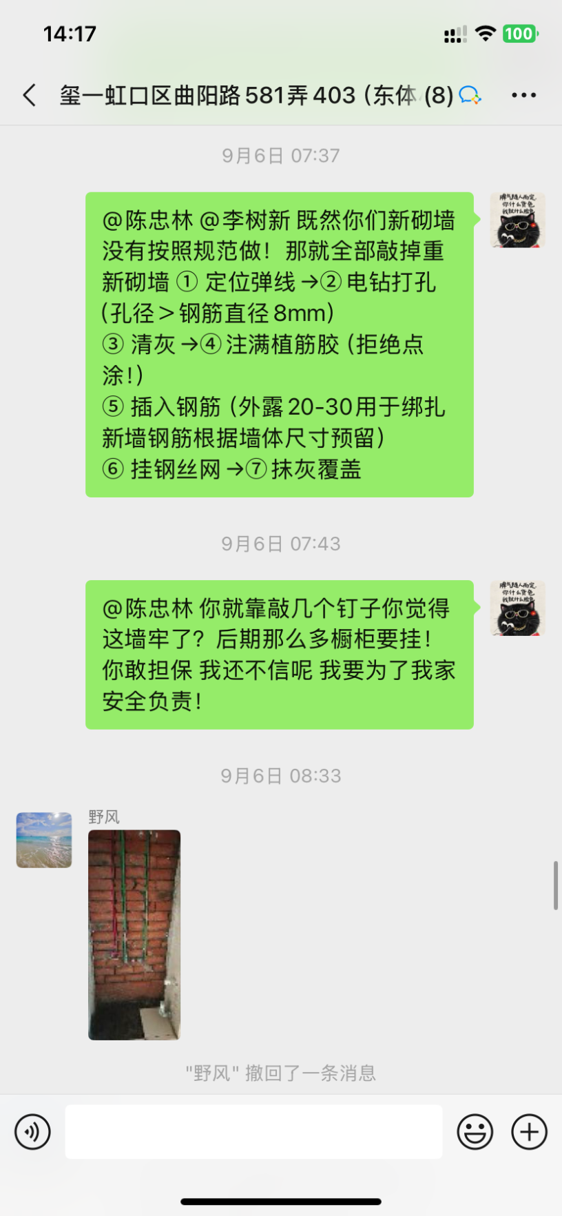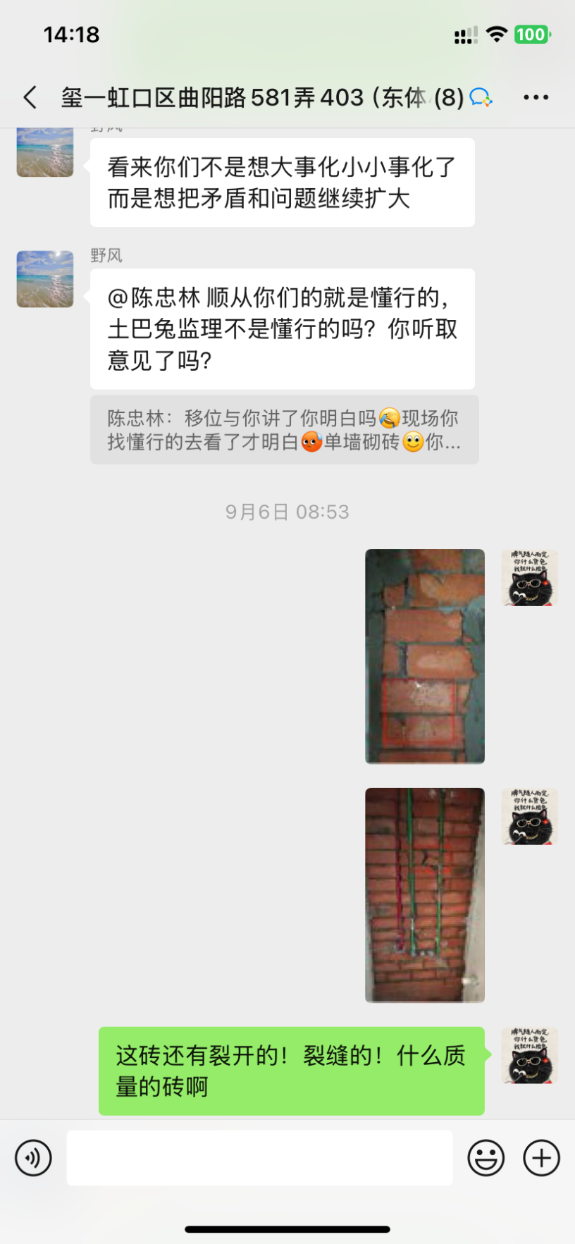 后期我這墻上還要掛吊柜、鏡柜、洗手臺(tái)柜體,這薄墻能承受住那么多重量嗎?項(xiàng)目經(jīng)理陳忠林大言不慚地拍胸脯說(shuō)可以承重500斤!為此我們也12345投訴了,迫于壓力正聚公司派出2位工程部經(jīng)理輪番來(lái)談判,他們談判的訴求無(wú)疑就是單方面保證這面墻就算沒(méi)有鋼筋也不要緊,不會(huì)倒塌,不會(huì)有任何風(fēng)險(xiǎn)。但是我們請(qǐng)的第三方監(jiān)理為了安全考慮,要求他們把墻拆掉按照規(guī)范要求砌墻,下面做地梁!他們對(duì)監(jiān)理提出的方案表示否認(rèn),不肯拆掉重做!而且陳忠林始終不認(rèn)為自己有錯(cuò),態(tài)度上非常強(qiáng)硬,死扛自己是沒(méi)問(wèn)題的!這種態(tài)度讓我們?nèi)虩o(wú)可忍,最后談不攏,我們提出要和正聚解約,10月15日正聚的結(jié)算單上居然還要我們付20%的違約金18000。因?yàn)樗麄兊馁|(zhì)量問(wèn)題又不肯整改,而且我們?cè)谔岢稣姆桨负蠛荛L(zhǎng)一段時(shí)間他們沒(méi)有任何回應(yīng),停工也快一個(gè)月了,這種情況我們要求解約,還要算我們違約?真的是沒(méi)有天理了!