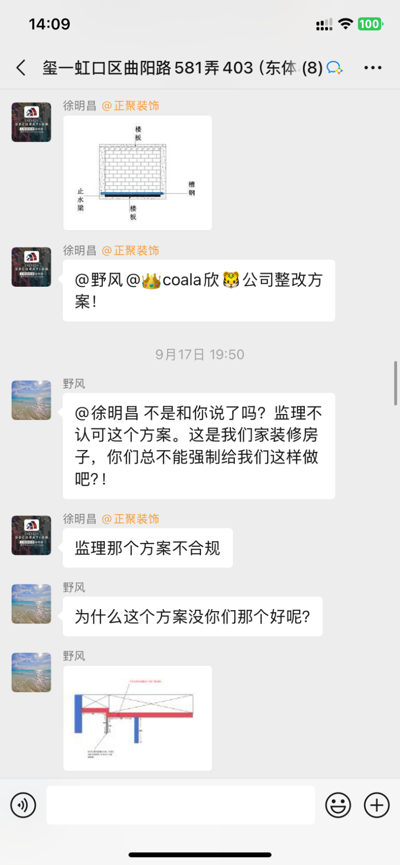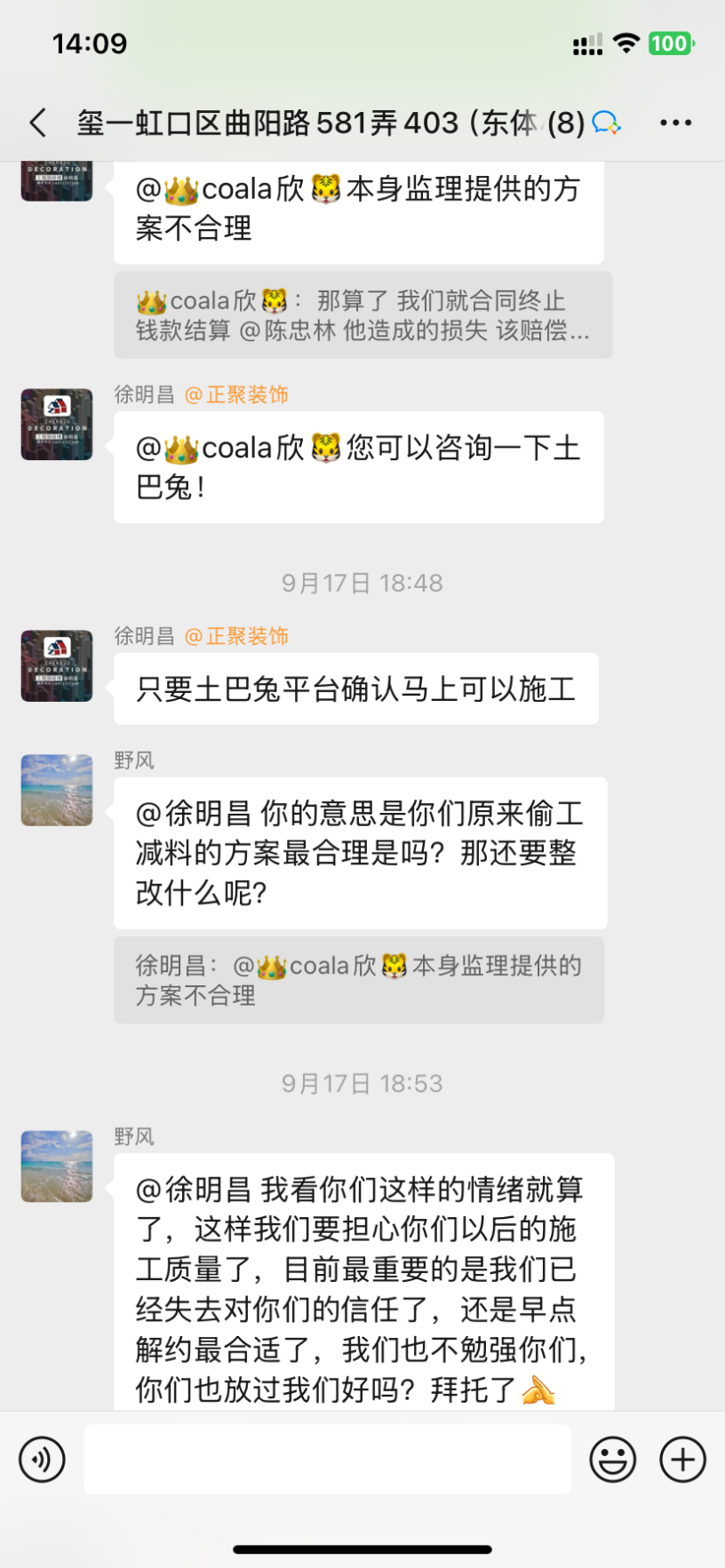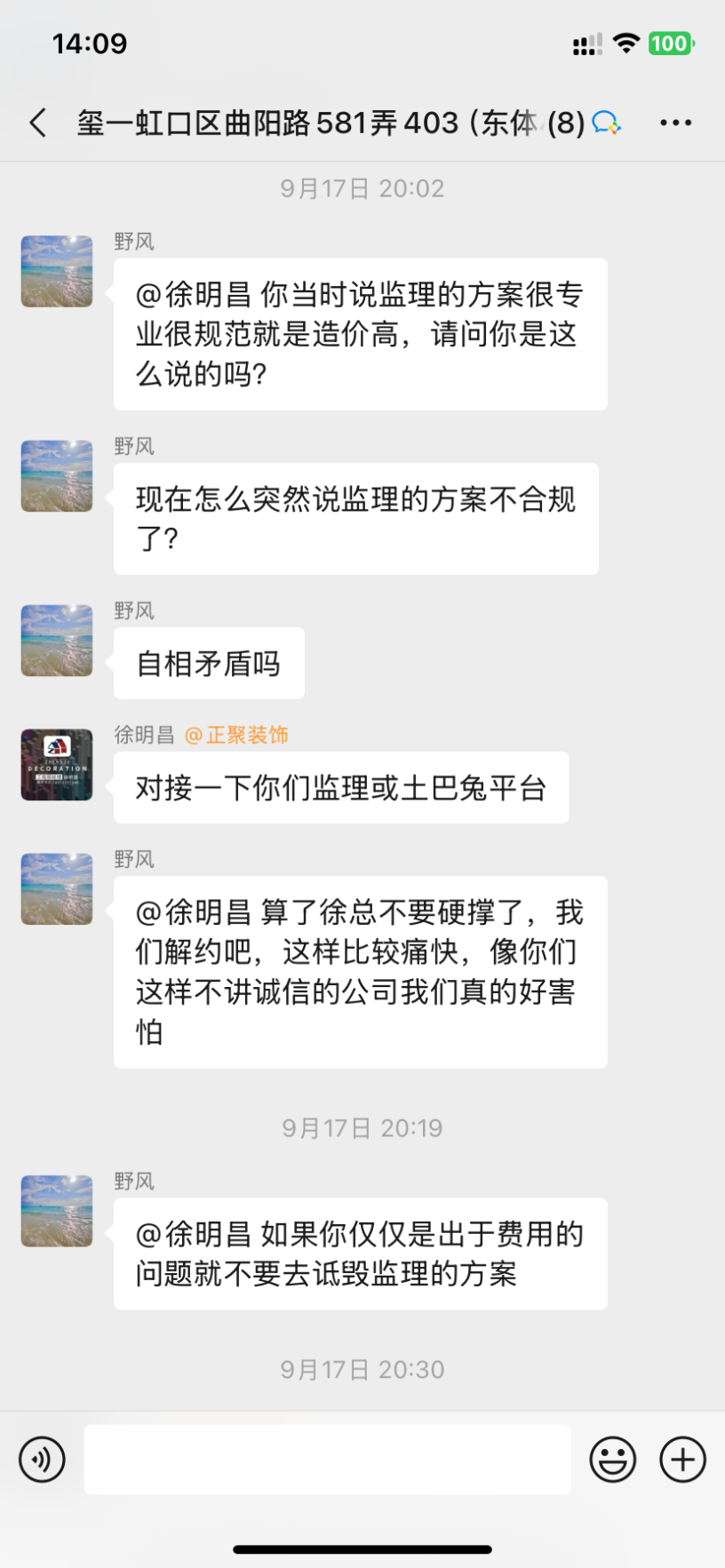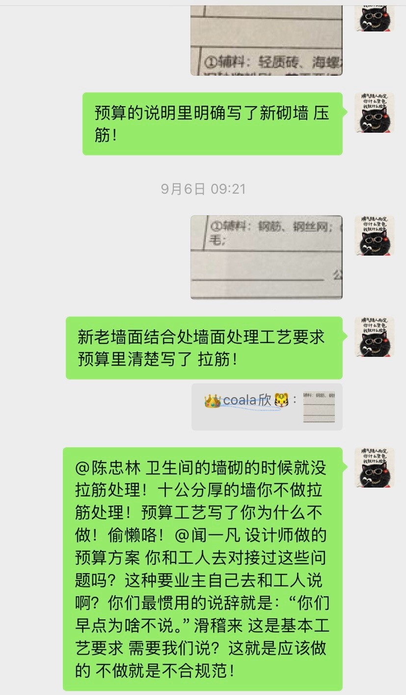 1、設(shè)計(jì)師聞一凡為了把預(yù)算總額降低,預(yù)算里故意漏項(xiàng),然后后期項(xiàng)目經(jīng)理陳忠林再一步步引誘業(yè)主,不停加錢。而且每次付錢都是項(xiàng)目經(jīng)理問(wèn)我們私下轉(zhuǎn)賬,不經(jīng)過(guò)公司賬戶,后來(lái)因?yàn)橐恢睈阂饧禹?xiàng)我們向12345又投訴了,他們派了李樹(shù)新來(lái)和我們談判,他當(dāng)時(shí)說(shuō)我們把錢交給陳忠林就是和工頭私下交易的,不屬于公司行為。但是后來(lái)他們負(fù)責(zé)人徐明昌又在群里說(shuō):項(xiàng)目經(jīng)理代表公司可以收費(fèi)!兩個(gè)人說(shuō)法截然不同,自相矛盾。