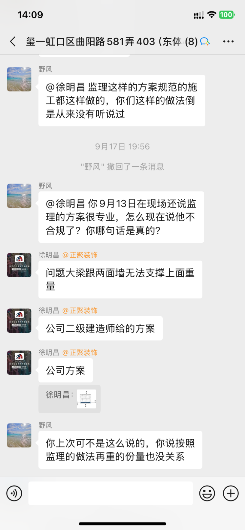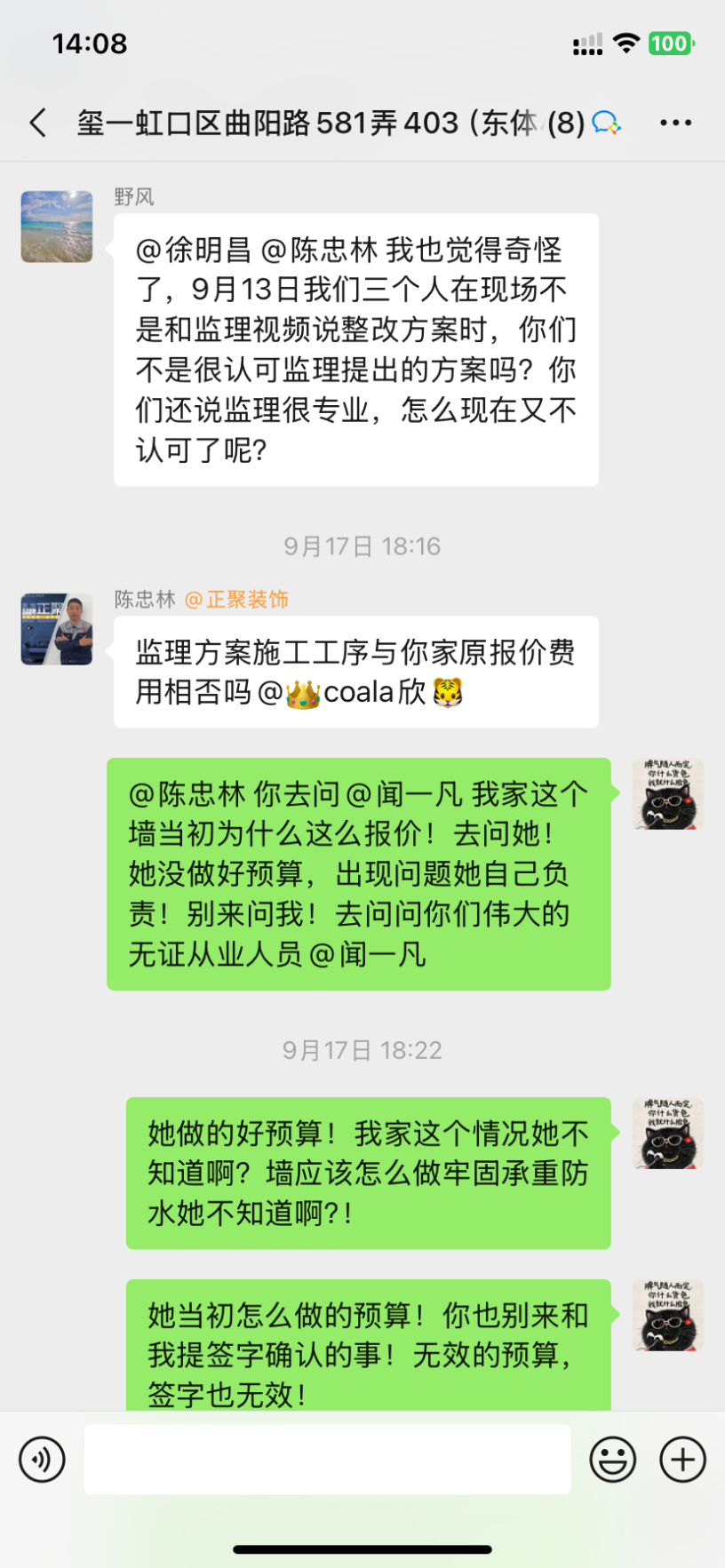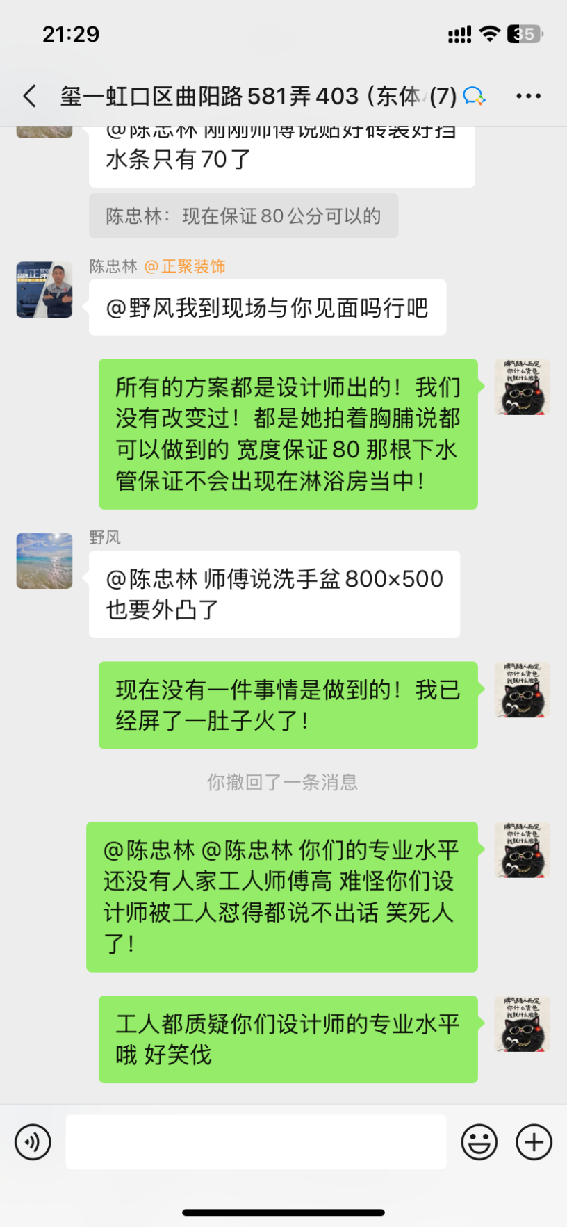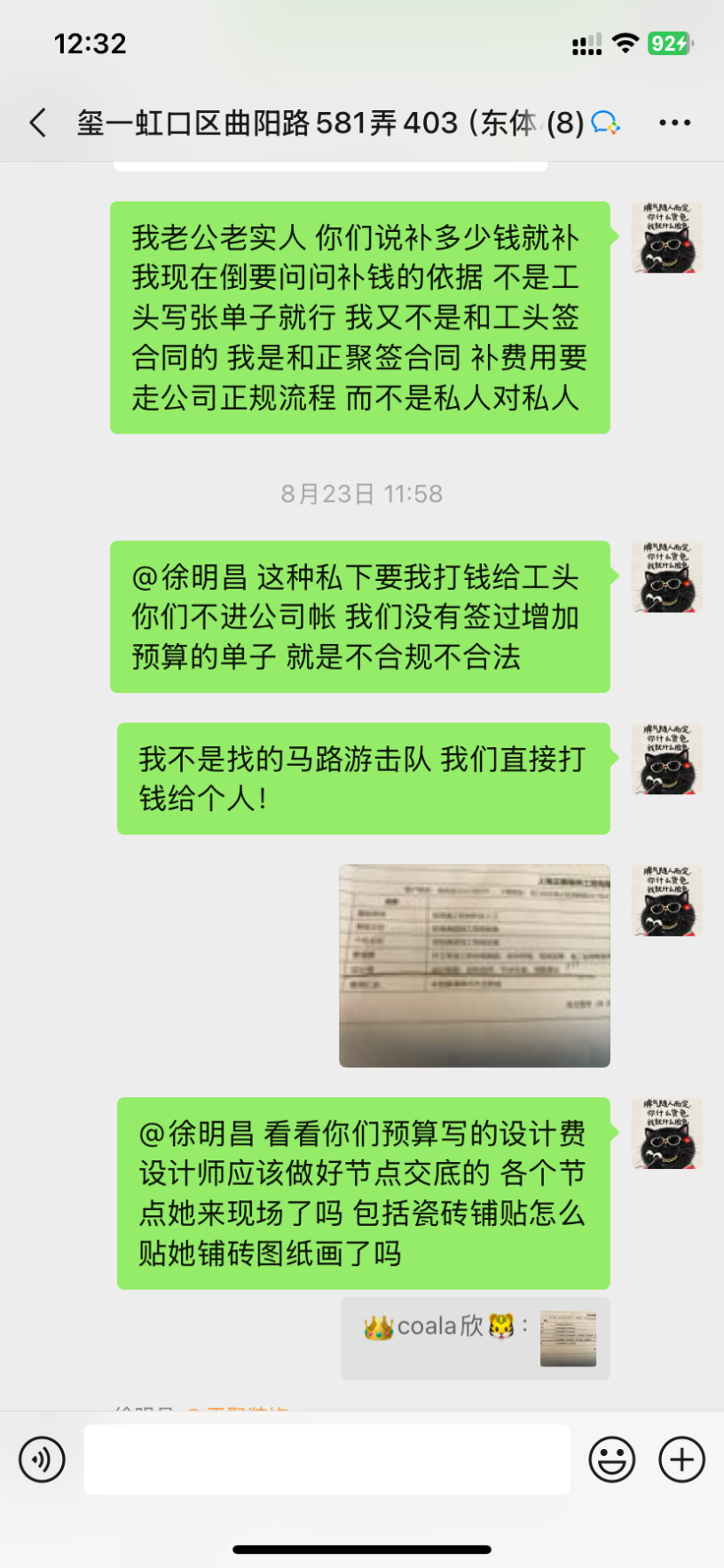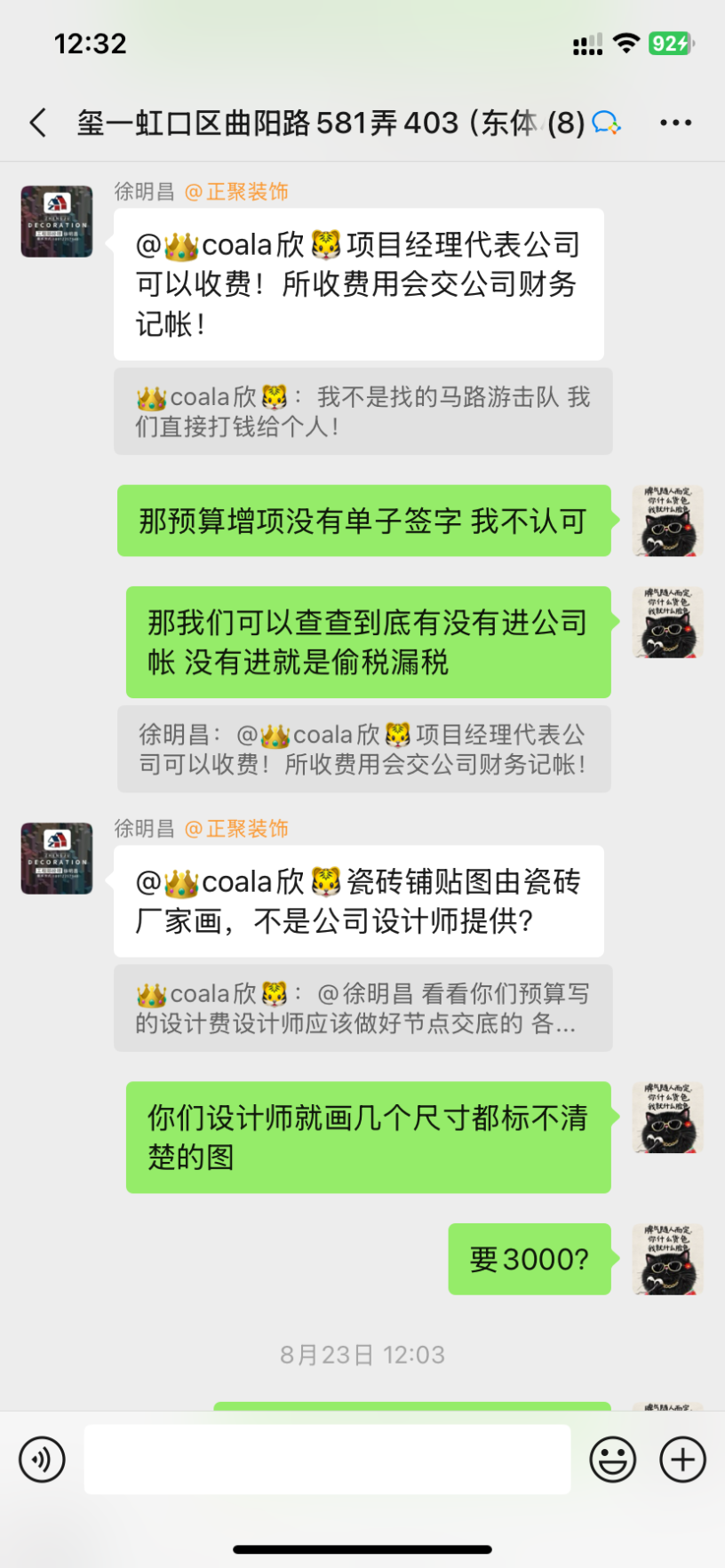 1、設(shè)計(jì)師聞一凡為了把預(yù)算總額降低,預(yù)算里故意漏項(xiàng),然后后期項(xiàng)目經(jīng)理陳忠林再一步步引誘業(yè)主,不停加錢。而且每次付錢都是項(xiàng)目經(jīng)理問(wèn)我們私下轉(zhuǎn)賬,不經(jīng)過(guò)公司賬戶,后來(lái)因?yàn)橐恢睈阂饧禹?xiàng)我們向12345又投訴了,他們派了李樹(shù)新來(lái)和我們談判,他當(dāng)時(shí)說(shuō)我們把錢交給陳忠林就是和工頭私下交易的,不屬于公司行為。但是后來(lái)他們負(fù)責(zé)人徐明昌又在群里說(shuō):項(xiàng)目經(jīng)理代表公司可以收費(fèi)!兩個(gè)人說(shuō)法截然不同,自相矛盾。