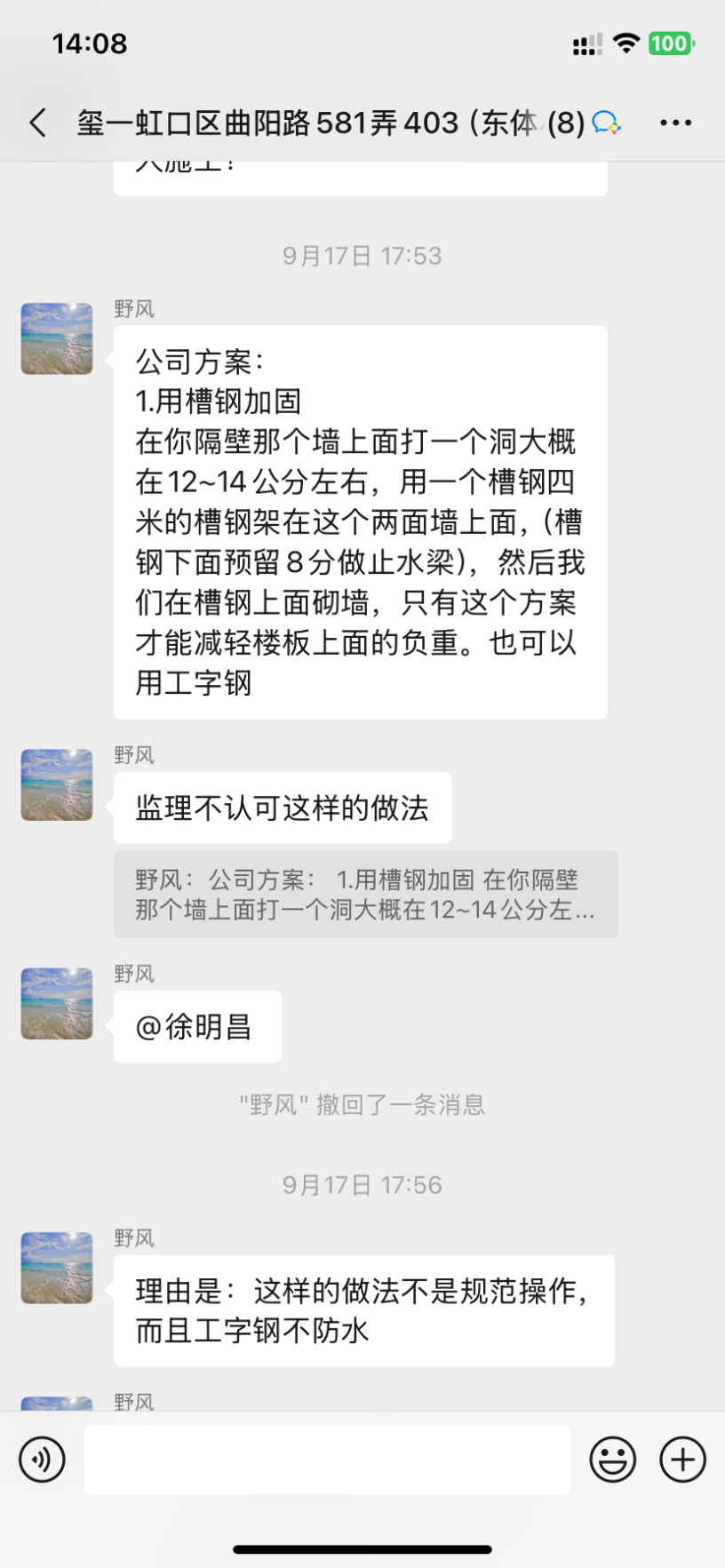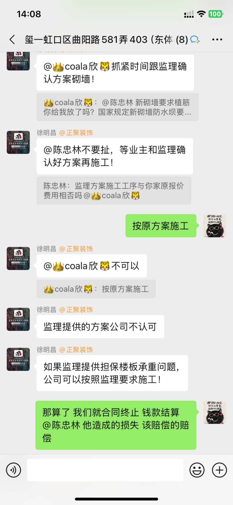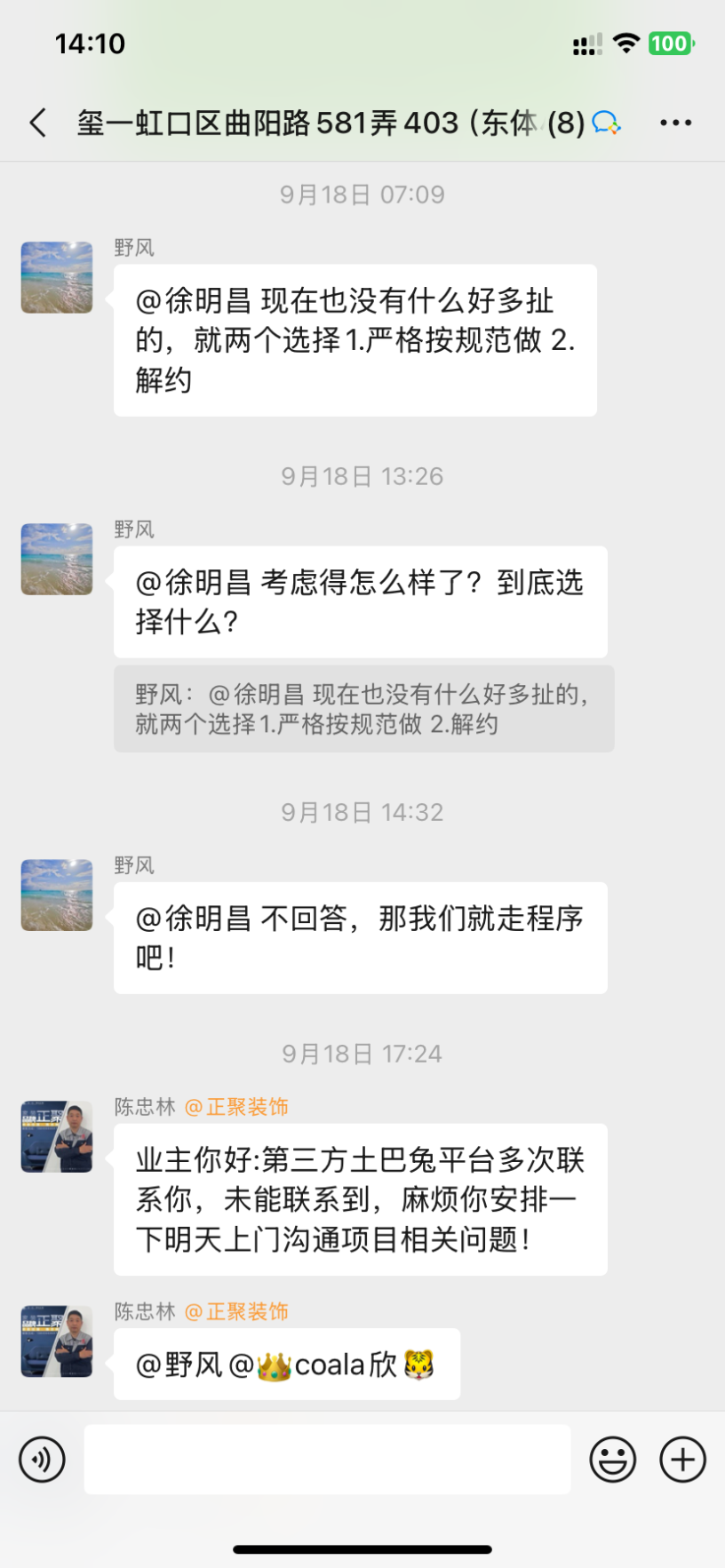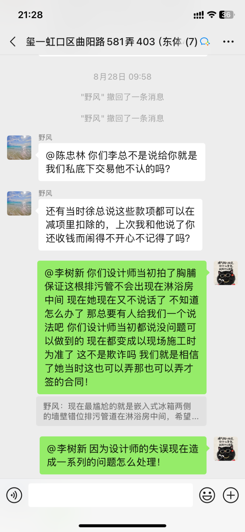 1、設(shè)計(jì)師聞一凡為了把預(yù)算總額降低,預(yù)算里故意漏項(xiàng),然后后期項(xiàng)目經(jīng)理陳忠林再一步步引誘業(yè)主,不停加錢。而且每次付錢都是項(xiàng)目經(jīng)理問(wèn)我們私下轉(zhuǎn)賬,不經(jīng)過(guò)公司賬戶,后來(lái)因?yàn)橐恢睈阂饧禹?xiàng)我們向12345又投訴了,他們派了李樹(shù)新來(lái)和我們談判,他當(dāng)時(shí)說(shuō)我們把錢交給陳忠林就是和工頭私下交易的,不屬于公司行為。但是后來(lái)他們負(fù)責(zé)人徐明昌又在群里說(shuō):項(xiàng)目經(jīng)理代表公司可以收費(fèi)!兩個(gè)人說(shuō)法截然不同,自相矛盾。