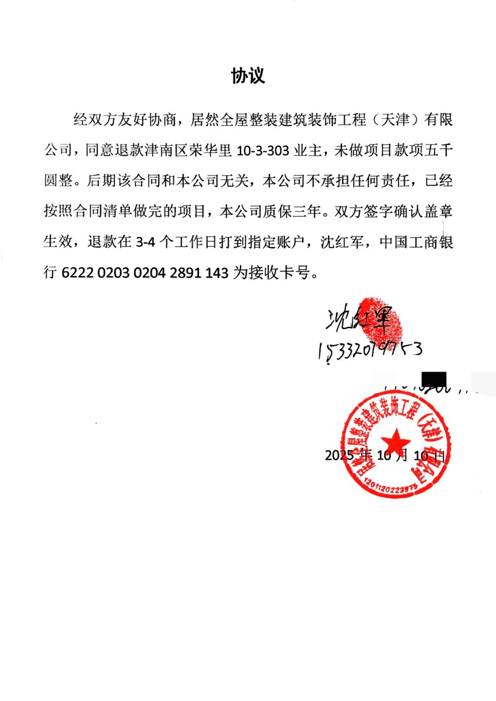 | 投訴類型 | 其它 | 投訴人 | 沈** | 被投訴單位 | 居然整裝建筑裝飾工程(天津)有限公司 |