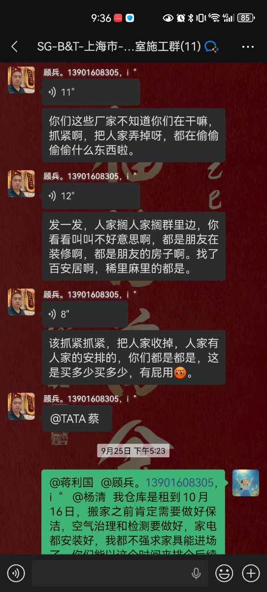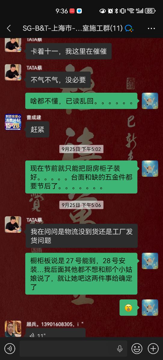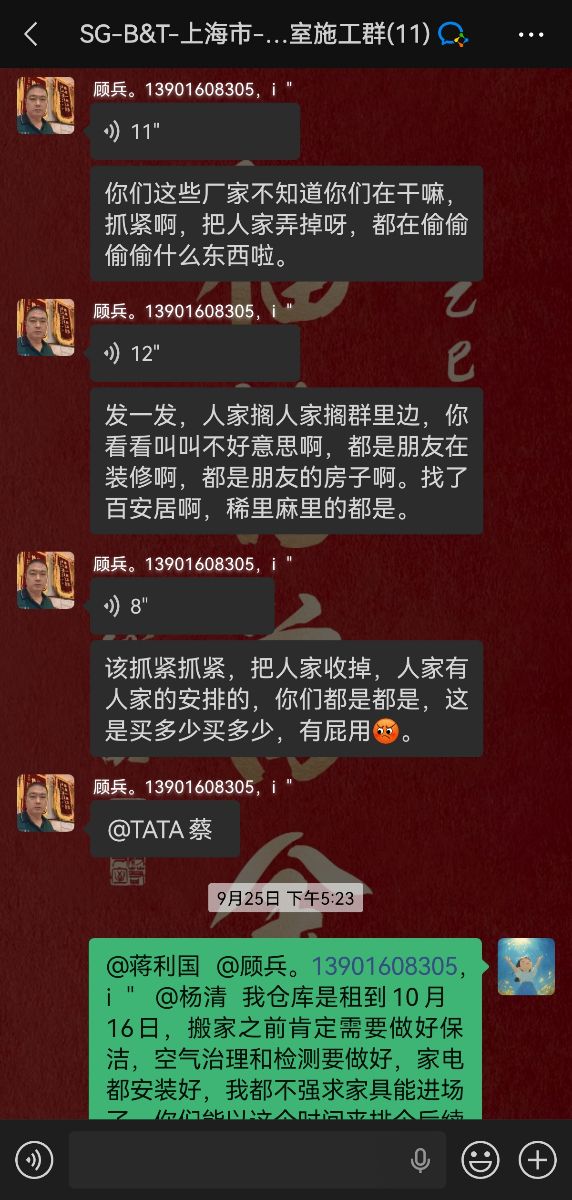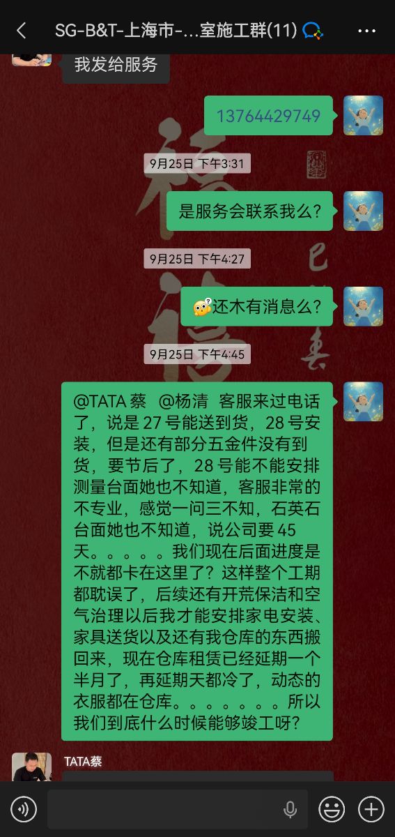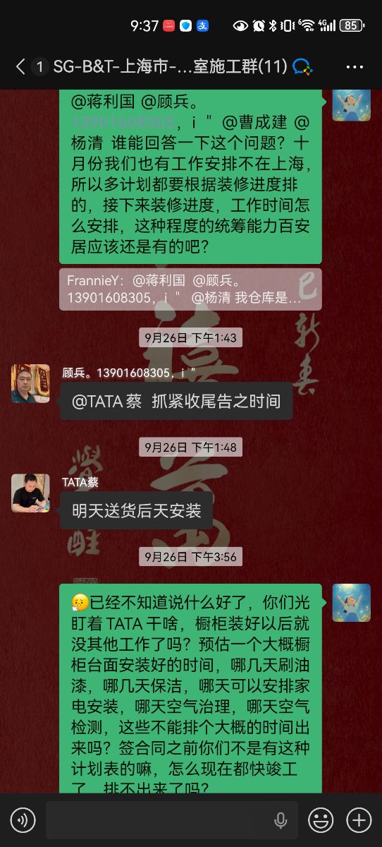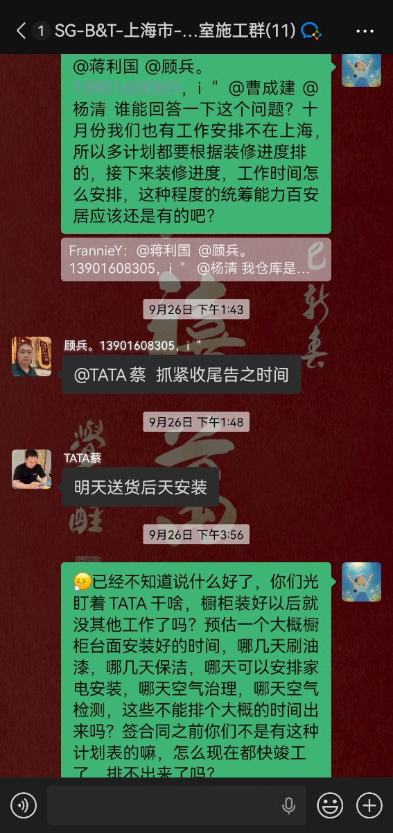 1. 工期管理混亂:2025 年 6 月中旬開工的全包裝修,至今 4 個(gè)多月未竣工,無明確竣工計(jì)劃,僅施工隊(duì)長在跟進(jìn)管理,不符合行業(yè) “項(xiàng)目專人負(fù)責(zé)制” 要求。