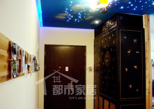 最獨(dú)特的要數(shù)天花板的處理了,藍(lán)藍(lán)的閃閃的,就像是晴朗的夜空一般迷人。設(shè)計師解釋說:“此處的效果實現(xiàn)方法其實很簡單,先用普通的石膏板吊頂,然后在石膏板上做出很多直徑1厘米左右的小孔,最后在小孔內(nèi)部放置光纖就可以了。光纖的顏色可以隨意變換,星星點點,神秘而浪漫?!?/FONT>