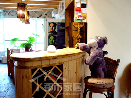 廚房和餐廳之間原本是有實體墻隔開的,為了營造閑適野趣的生活氛圍,設(shè)計師拆掉了這堵墻,取而代之的是這個松木的吧臺。吧臺中部的藏酒格讓人聯(lián)想到樸實可愛的東南亞小酒館。
