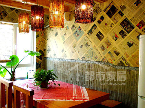 餐廳是一個尤其特別的空間,首先我們會被滿墻的英文報紙給吸引住,很奇特的裝飾手法!報紙整齊地斜鋪給空間帶來韻律感,圖文并茂又讓人不禁想要關(guān)注其中的故事,泛黃的顏色在這里營造了一種懷舊的氛圍,這是整個餐廳最驚艷的一面。是壁紙嗎?設(shè)計師解釋道:“這其實是真正的報紙,是業(yè)主收集的關(guān)于某次事件所有報道的報紙,很有紀(jì)念意義。我們把報紙緊緊貼在墻上,然后在報紙上刷一層清漆,這樣報紙就完全被封在漆里,不會再變形變色了?!?/FONT>
