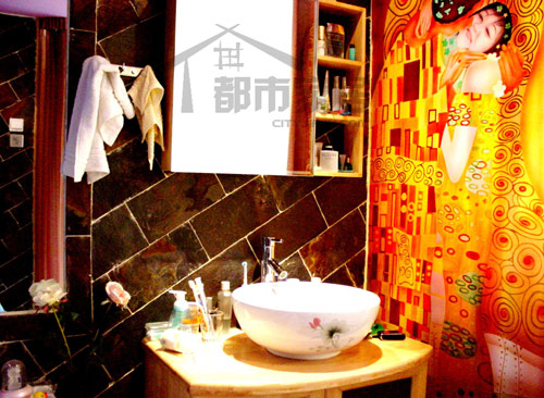 最為讓人意外的畫面就在這里出現(xiàn)了!沒錯,就是這幅金燦燦的玻璃彩繪,猛一看有點詭異吧~至少小編是這么認(rèn)為的。設(shè)計師告訴我們:“其實這是一幅法國名畫《吻》,只是把畫中女人的臉換成了業(yè)主女友的臉?!迸叮瓉砣绱?,是名畫與真人的拼接啊,難怪有那么點詭異的效果,呵呵。