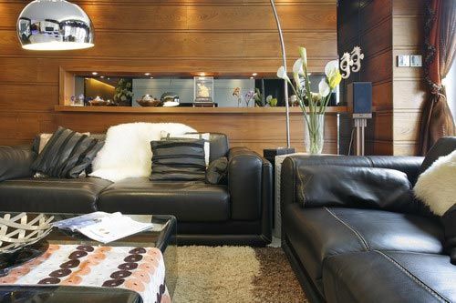 客廳后面:木質(zhì)背景墻突出了空間的貴氣,同時(shí)兼做展示柜給了主人更多凸顯品味的空間。