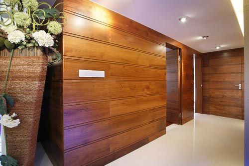廊道一側(cè):木質(zhì)墻板的大面積使用凸顯空間華貴,配和藤制的藝術(shù)花瓶讓空間莊重又不失優(yōu)雅。