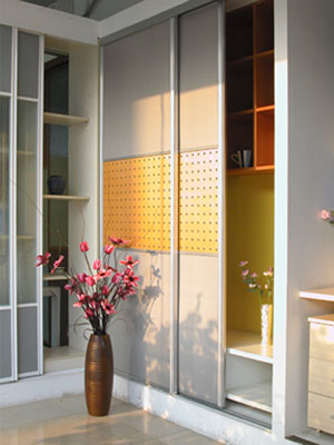 帶有滑動門的衣柜是最省空間的,它不會因為門板打開而阻塞通道。購買時人們往往只關注滑動門的款式和顏色,而忽略了導軌。好的導軌在設計上會有兩個防跳裝置,以確保柜門滑行時安全不彈回。只有一個防跳裝置或沒有防跳裝置的滑輪,使用時門容易出軌。