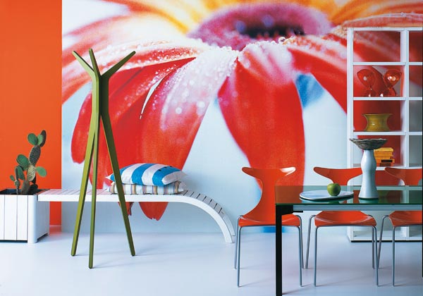 以曲線和色彩裝點(diǎn)房間各個角落。左起,內(nèi)層為鋅質(zhì)缸盆的花盆架(cm45×45×43高,215歐元),與弧形的Adamo長凳相連(cm178×38×45高,390歐元,整體設(shè)計(jì)以白色上漆的野生松木為材質(zhì),Pircher出品),條紋靠墊(Linum出品,約25.40 歐元/個)。HI!綠色白樺木掛衣架,顏色還有紫紅色、櫻桃色和黑色(Pascal Tarabay設(shè)計(jì),Diamantini&Domeniconi出品,cm55×55×172高,300歐元起價)。同樣為綠色的水晶桌面,黑色涂層的鋼制結(jié)構(gòu),桌子的尺寸和顏色都可以選擇,同樣也可以根據(jù)需要加長長度(這里的尺寸:cm140×80×76高,966歐元)。紅色Delfy椅子,外殼為光亮的工程塑料材質(zhì)(Gino Carollo設(shè)計(jì),Ciacci Kreaty出品,有各種顏色選擇,144 歐元/把)。桌面上,白色陶瓷的 Zurbaran水果盤(Studio Sigla設(shè)計(jì),Terre Blu出品),細(xì)頸陶瓷瓶和小籃子(Sardegna Lab出品)。后面,用Wall to Wall組合模式制作的漆木書架(Poliform出品,這里的尺寸:cm105×32×197高)。架子上,兩個Dalu'燈的新版造型(Vico Magistretti 1965年設(shè)計(jì),Artemide出品,59歐元/個),陶瓷花瓶(Luca Scacchetti設(shè)計(jì),Terre Blu出品,140歐元)。采用Gerbera面料的巨幅墻布裝飾(Jannelli&Volpi出品,Magic Walls系列,共8塊裝飾布,整體尺寸cm372×270, 405.60歐元)