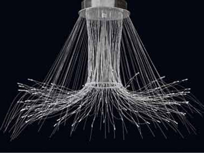 吊燈有著啟發(fā)性設(shè)計(jì)和強(qiáng)烈沖擊感。精細(xì)閃耀的重復(fù)線條向周?chē)鷶U(kuò)散,就像王冠。彎曲和拉緊的線條相結(jié)合,使其特別適合于所表現(xiàn)的氛圍。